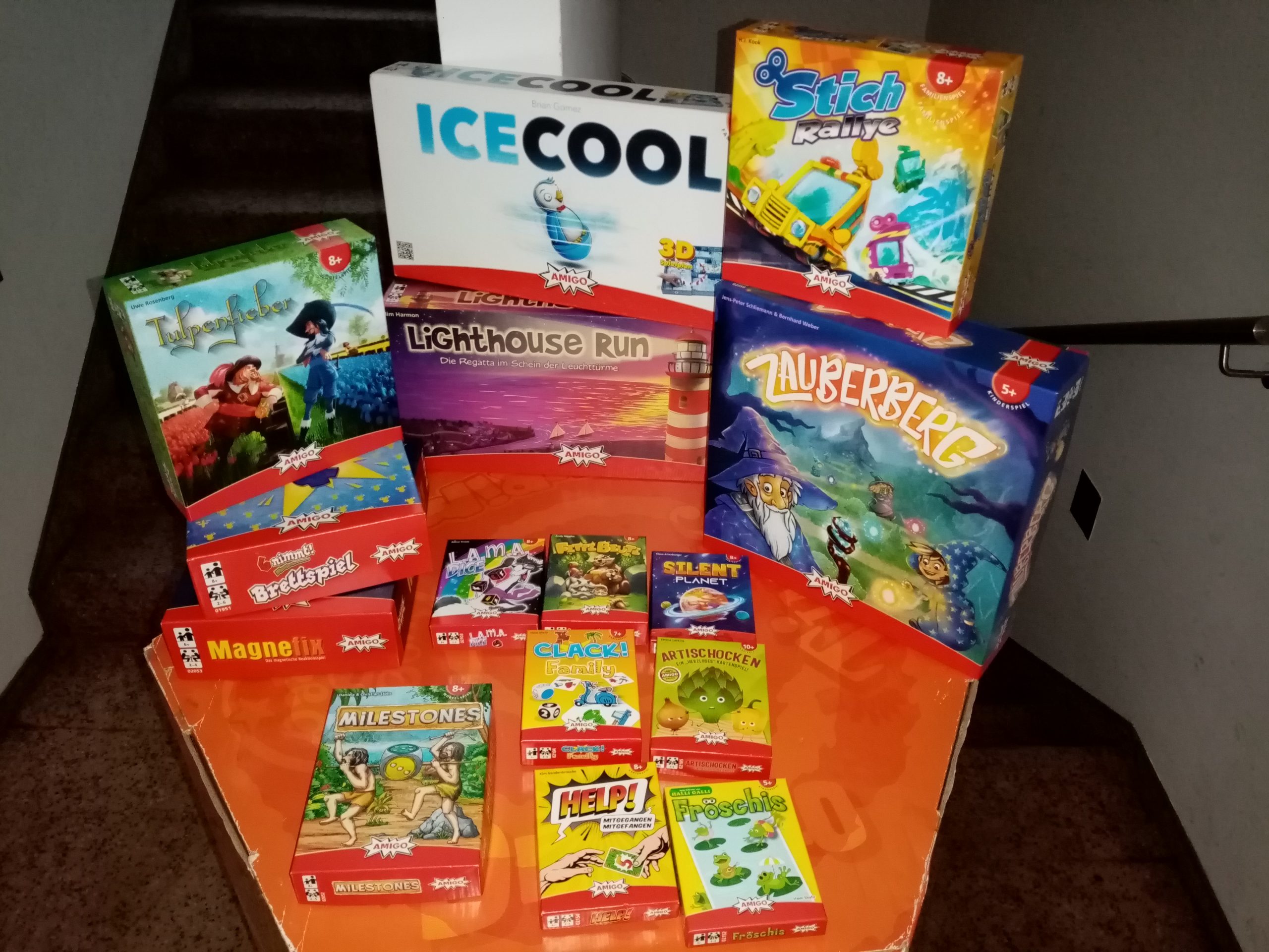 Und daher haben wir uns entschlissen, dieses Wochenende auch zum Amigo Wochenende auszurufen. Wir spielen Amigo Spiele auf und ab. Die Neuheiten aus dem Herbst, aber auch aus dem Frühjahr, die ja zu kurz gekommen sind. Und auch altbewährtes: Zauberberg, Fröschis, Help, Tulpenfieber, Stichrally, Fette Beute, Artischoken, Lama Dice, Silent Planet, Magnefix, 6 Nimmt Brettspiel, Icecool, Lighthouse Run.