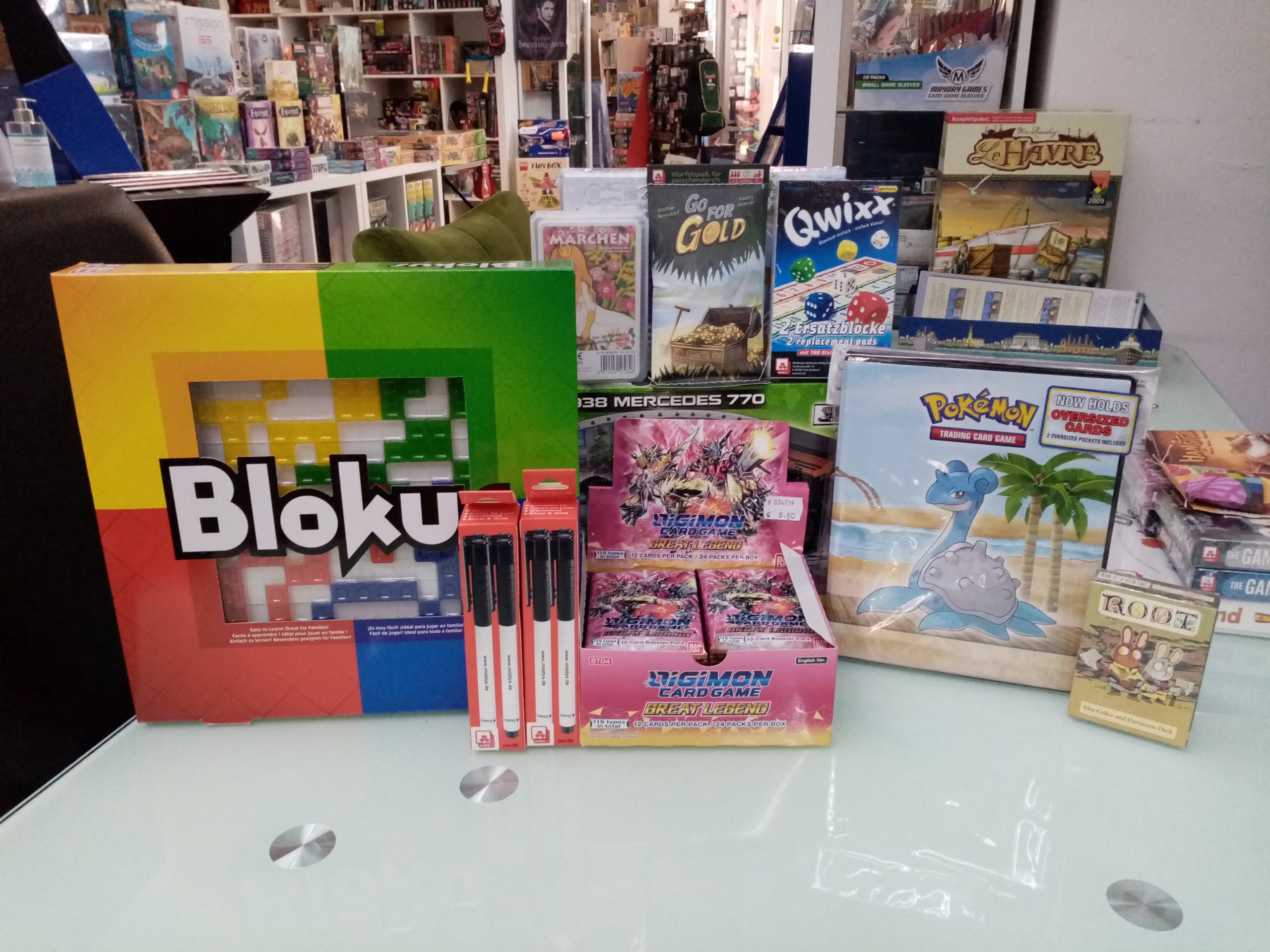 Unsere ersten Digimon Karten sind im Haus. Den 3D Puzzle Bus von Harry Potter konnten wir noch ein letzten Mal organisieren. Mit Blokus und Qwixx haben wir Klassiker im Haus. Ein Märchenquartett ist neu im Sortiment. Dice Town ist das perfekte Spiel für alle Würfelpoker Fans . ein echt gute Abwandlung. Ein Dobby Figur hat auch den Weg zu uns gefunden. den Pandemiepoker haben wir wieder lagernd und auch bei den NSV Spielen haben wir unseren Bestand wieder aufgestockt mit Ohanami, The Game Face to Face, The Mind und anderen.