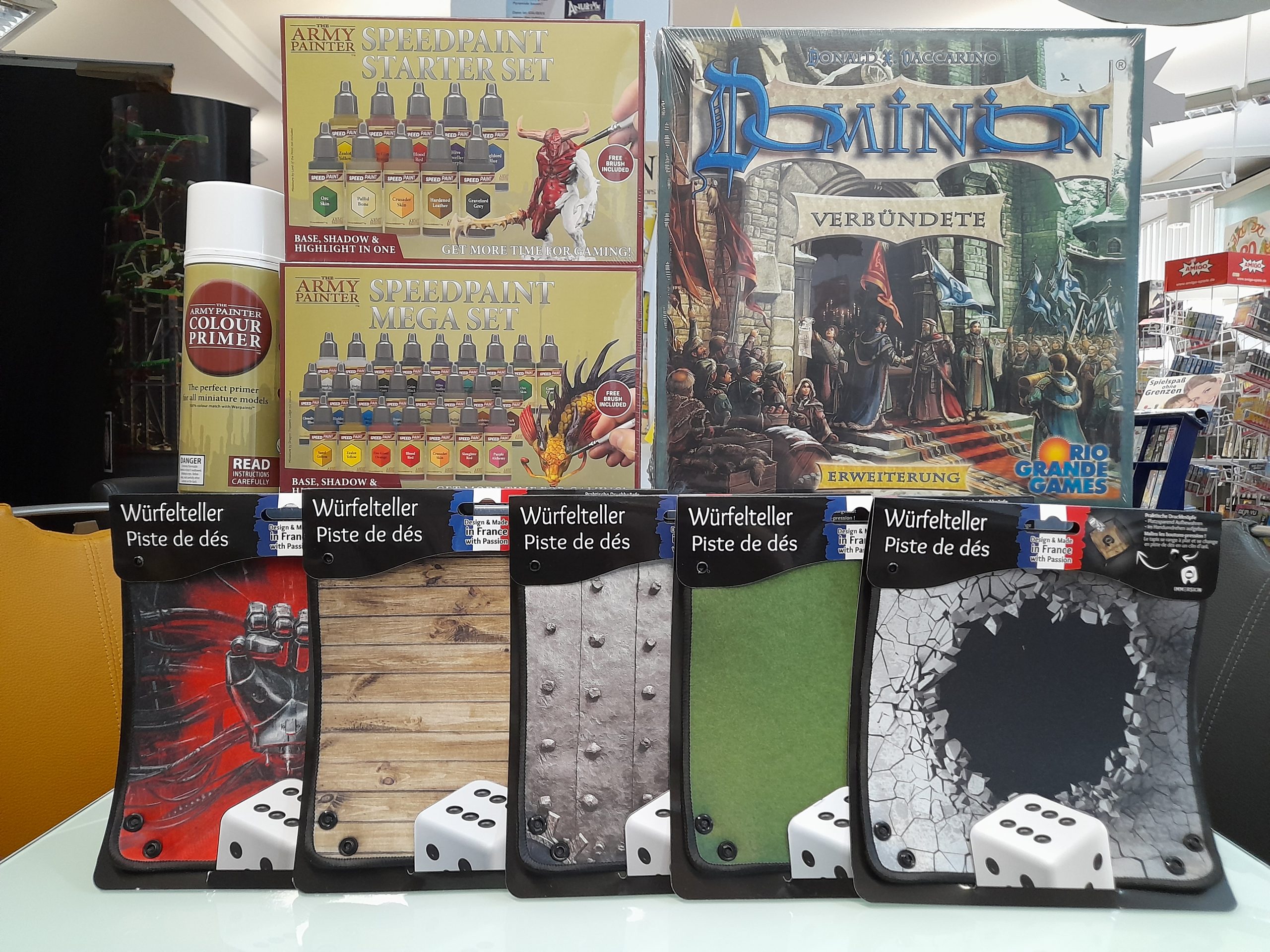 Wow, so viele Neuheiten. Die Dominion Familie ist um die Erweiterung Verbündete größer geworden. Similo glänzt mit einer Harry Potter Ausgabe. Und weitere Similos haben wir auch wieder nach bekommen. This War of mine kann sich nun auch mit einer Erweiterung rühmen – Geschichten aus den Ruinen – ein muß für alle Fans dieses Spiels. Army PAinter hat mit einer neuen Serie großartig gepunktet – Speed Paint. Wer immer schon schneller werden wollte, beim Bemalen seiner Minis, kann jetzt auf das Starter Set und auf das Mega Set zurück greifen. Ark Nova ist ja in Deutsch schon ein guter Renner, jetzt endlich bei uns auch im Haus auf Englisch erhältlich. Die Würfelteller haben wir wieder aufgestockt. Und Rainbow von Piatnik ist gefragt, genau wie auch die Deckscape Spiele.