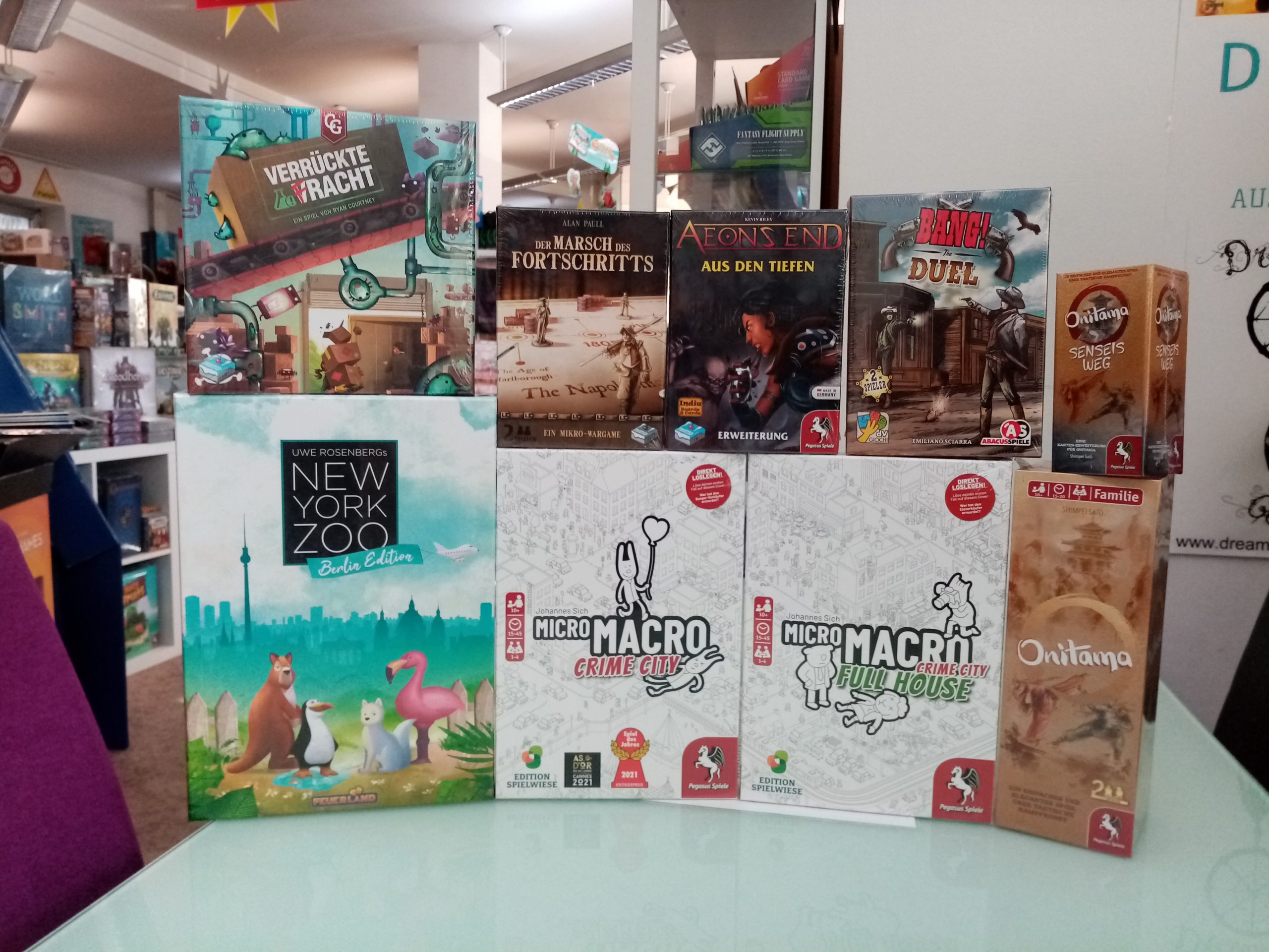 Frosted Games hat einige Neuheiten wie Verrückte Fracht und Der Marsch des Fortschritts. Auch unsere ersten Pokemon 25 Jahre Boxen waren im Haus. Ja leider waren, denn sie sind vorerst restlos vergriffen. Wir warten auf mehr. Dune Imperium ist endlich wieder verfügbar, und auch Space Base, darauf haben wir lange gewartet. Und auch Stone Age Junior gibt es wieder. Und Bloodborne das Kartenspiel hat eine Erweiterung bekommen. New York Zoo wurde mit der Berlin Edition neu belebt. Aber auch bei Micromacro haben wir zum Glück wieder Nachschub bekommen. Wer dabei schon an Weihnachtsgeschenke denkt, sollte schnell zugreifen, denn Micromacro wird wohl nicht mehr sehr lange in diesem Jahr zu bekommen sein.