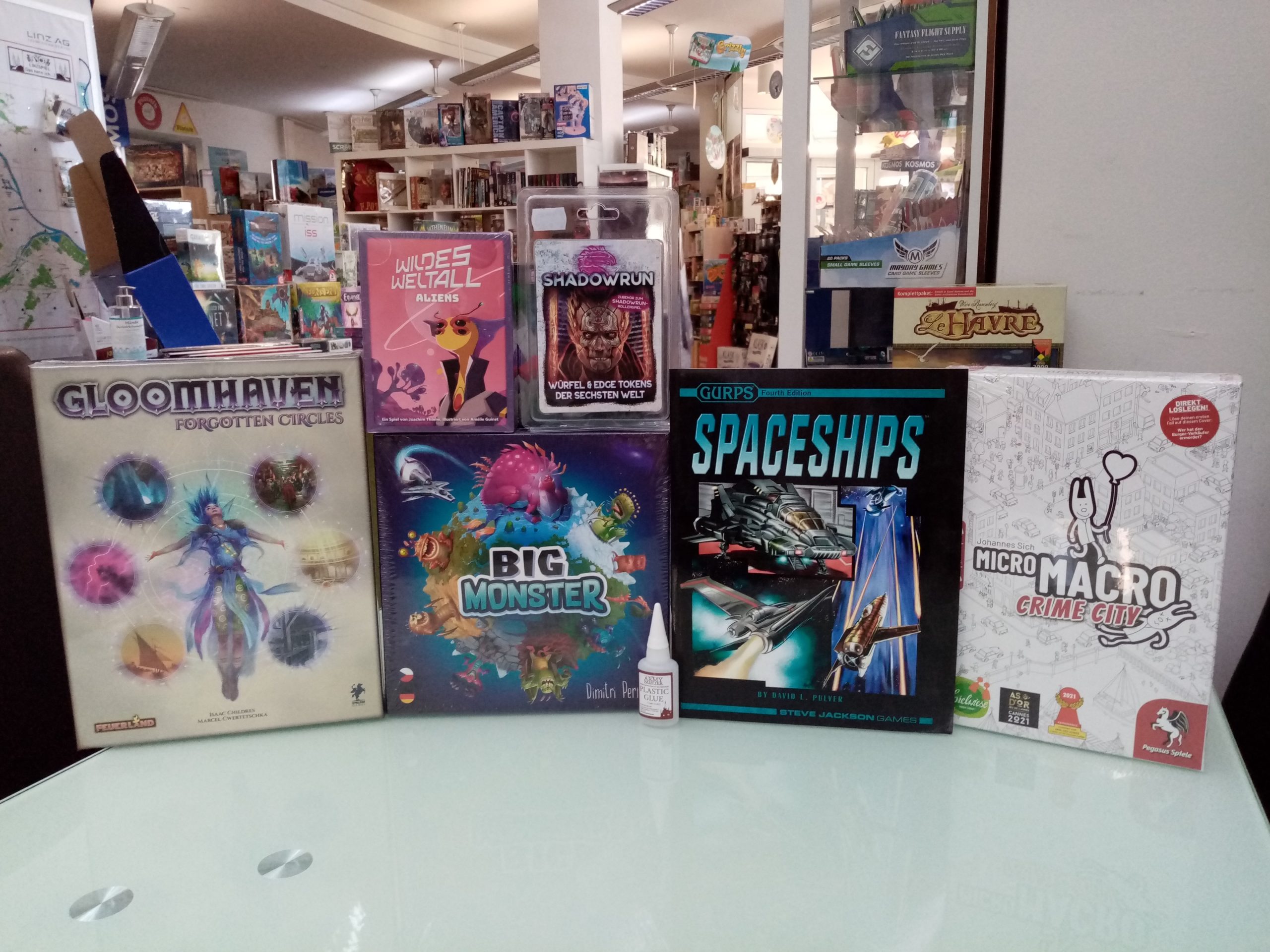 Gurps Scapeships hat unser Rollenspielregal erweitert. Die Ruinen von Arnak haben wir wieder da. Auch für Shadows of Brimstone haben wir einiges nachbekommen. Bloodborne das Brettspiel hat eine große Nachfrage bei uns im Haus. Zombicide Invader ist auch wieder im lagernden Sortiment. Monster Slaughter hatten wir lange nicht da. Auch Big Monster von Skellig Games haben wir wieder rein geholt. Es hat sich wieder viel getan bei uns.