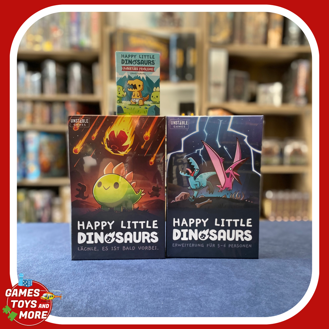 Im Partyspiel Happy Little Dinosaurs gewinnt das Spiel, wer als Erstes 50 Punkte erreicht oder als letzter Dinosaurier übrigbleibt. In jeder Runde drehen die Spieler eine Katastrophenkarte um, die eine Natur-, eine Raubtier- oder eine emotionale Katastrophe zeigt. Jeder Spieler spielt eine Punktekarte, um Punkte zu sammeln und die Katastrophe zu vermeiden.