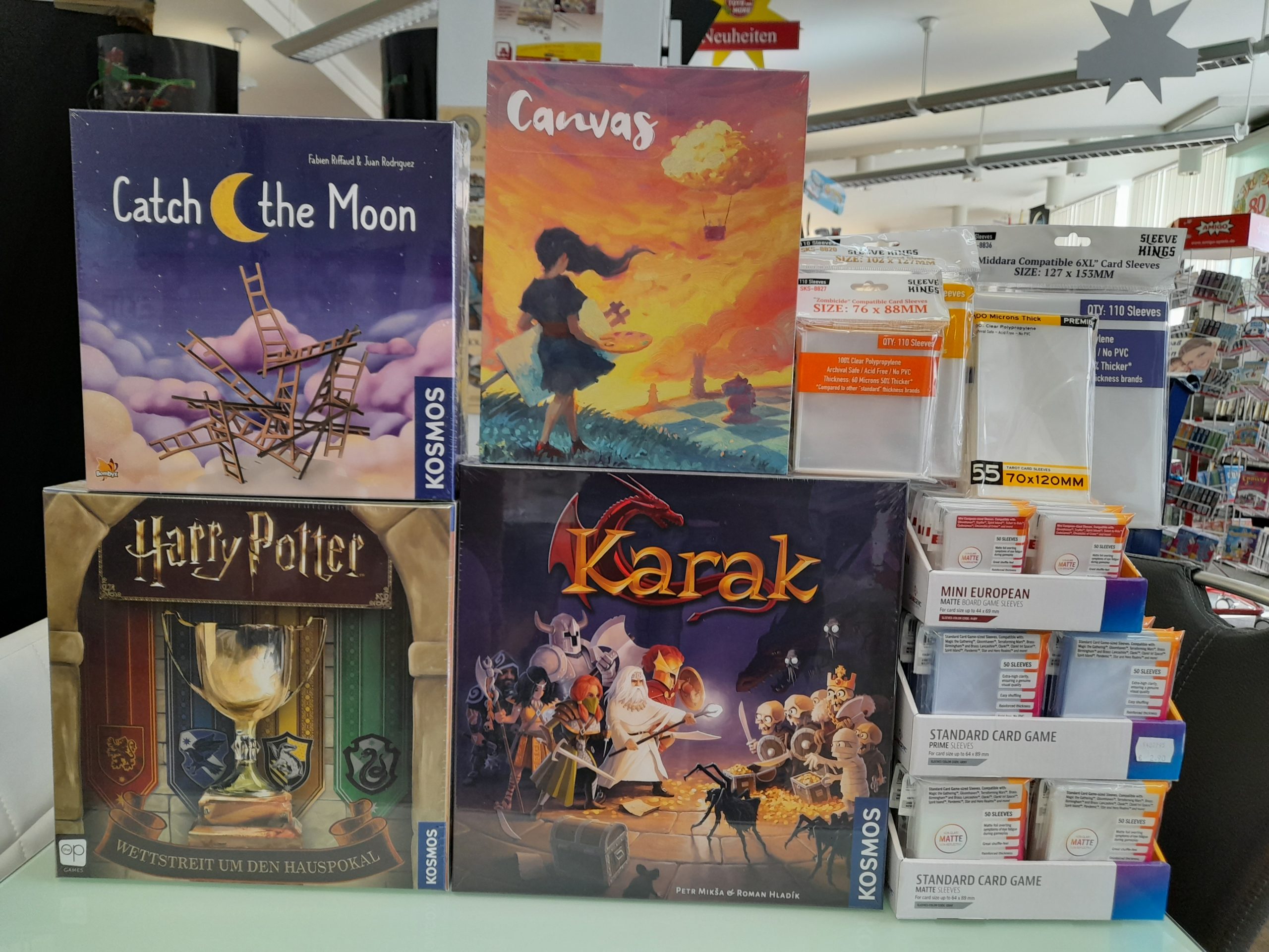 Die Neuheiten rasseln nur so herein. Harry Potter hat wieder zugeschlagen und jetzt könnt ihr den Wettstreit um den Hauspokal selbst bei euch zu Hause spielen. Jede Menge neuer Star Wars Puzzles sind zur Freude der Fans erschienen. Auch einiges an Figuren haben wir neu im Sortiment, also Auch Merchandise Artikel für die Star Wars Fans haben wir nicht vergessen. Catch the Moon könnte sich zu einem neuen Familienhit entwickeln, ist aber leider bei uns schon wieder vergriffen, genau wie Karak. Auch von Rebel Girls gibt es jetzt ein Spiel, von welchen Verlag also Wie Kosmos könnte das auch sonst kommen ;-). Mit Quacks & Co hat Schmidt nun eine Kinderausgabe des beliebten Quacksalber von Quedlinburg heraus gebracht, wie cool ist das denn. Es gibt noch so viel mehr, aber schaut selbst auf den Fotos oder besser gleich bei uns im Laden.