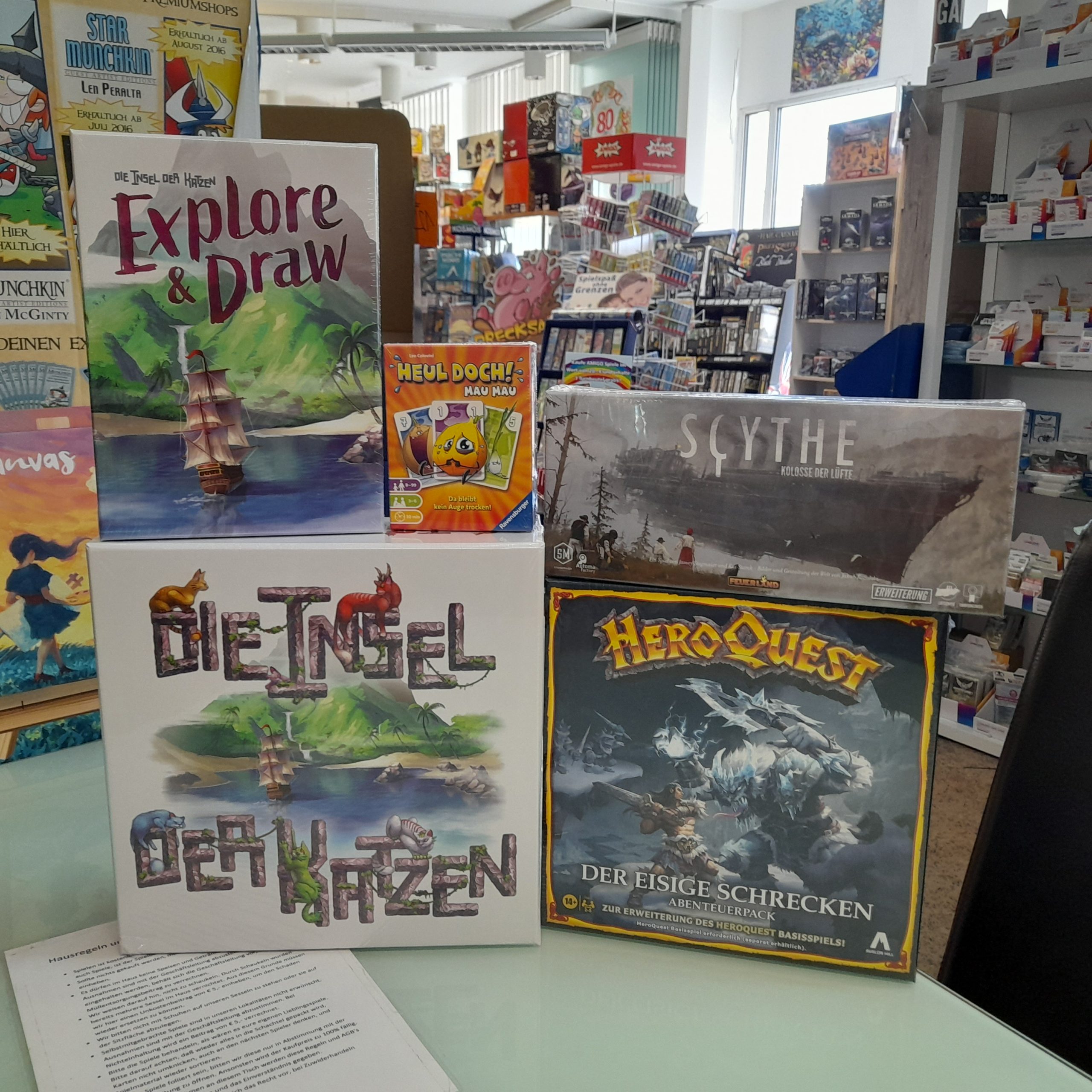 HeroQuest Der eisige Schrecken, Pokemon Go, Kemet Blut und Sand, Die Insel der Katzen, HABA, Munchkin, Yu Gi Oh!, Scythe