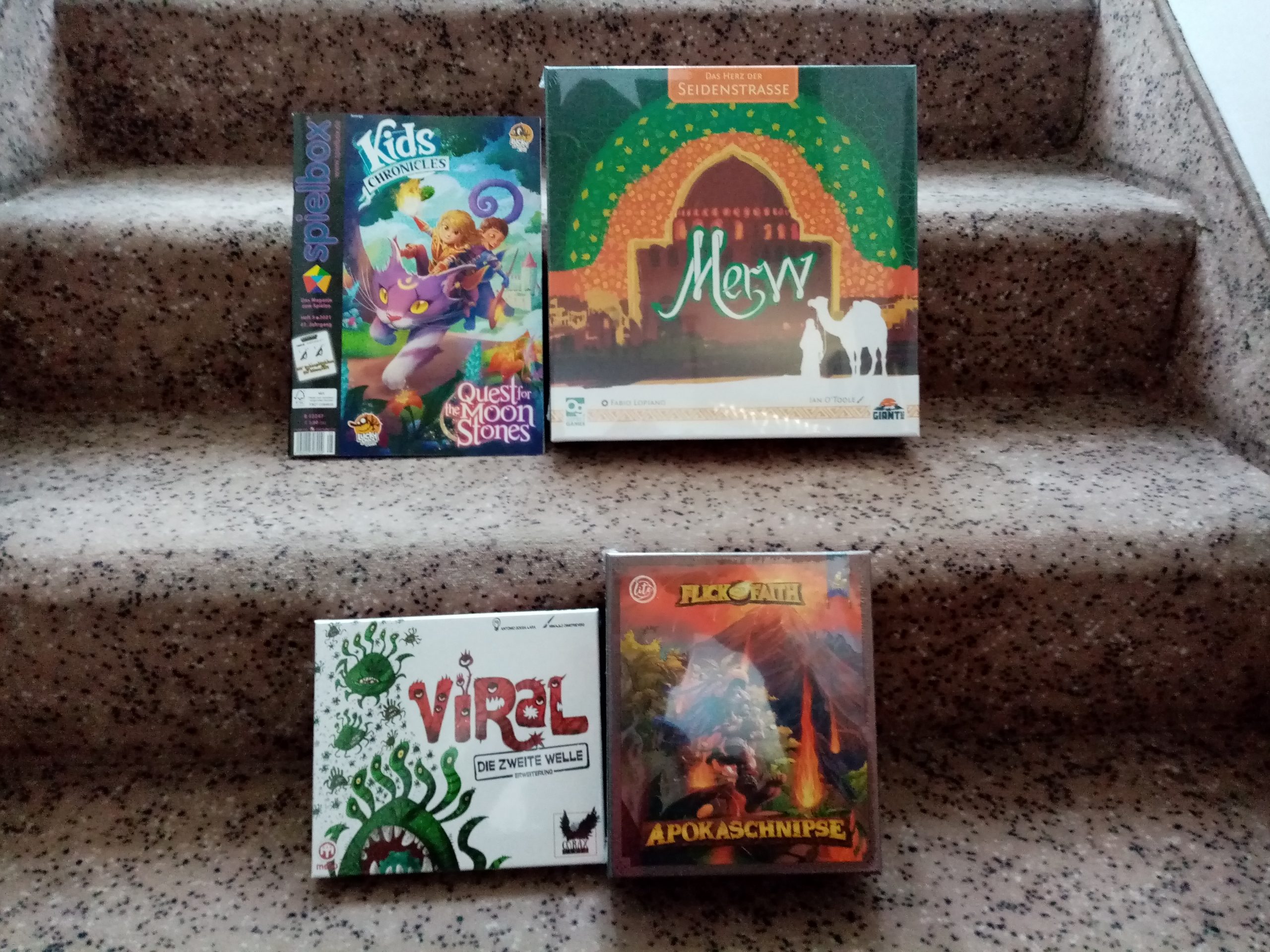 Merw gibt es nun endlich auch auf deutsch! Wir haben auch ein Demospiel im Haus zum ausprobieren – steht bei mir hoffentlich heute am Programm. Die neue Spielbox ist da – das Spielemagazin für den Brettspielfan mit Sonderausgabe zur Spiel in Essen. Und 2 Erweiterungen können wir auch anbieten: Flick of Faith und Viral. Und Explorers von Ravensburger haben wir wieder nachbekommen. Und auch 2 sensationelle Puzzles sind eingetroffen: Der Kartograph und Roll Player. Und auch im Merch Bereich ist wieder was eingetroffen: John Wick Modellautos und neue Funko Pop Figuren. Und ich konnte es selbst nicht glauben, auch für das englische Star Wars RPG haben wir wieder 2 Bücher erhalten! Und richtig genial ist die Spielmatte für Eclipse. Und wer noch nicht genug gelesen hat, findet auf den Fotos noch einiges mehr, und a besten einfach rein schauen bei uns.