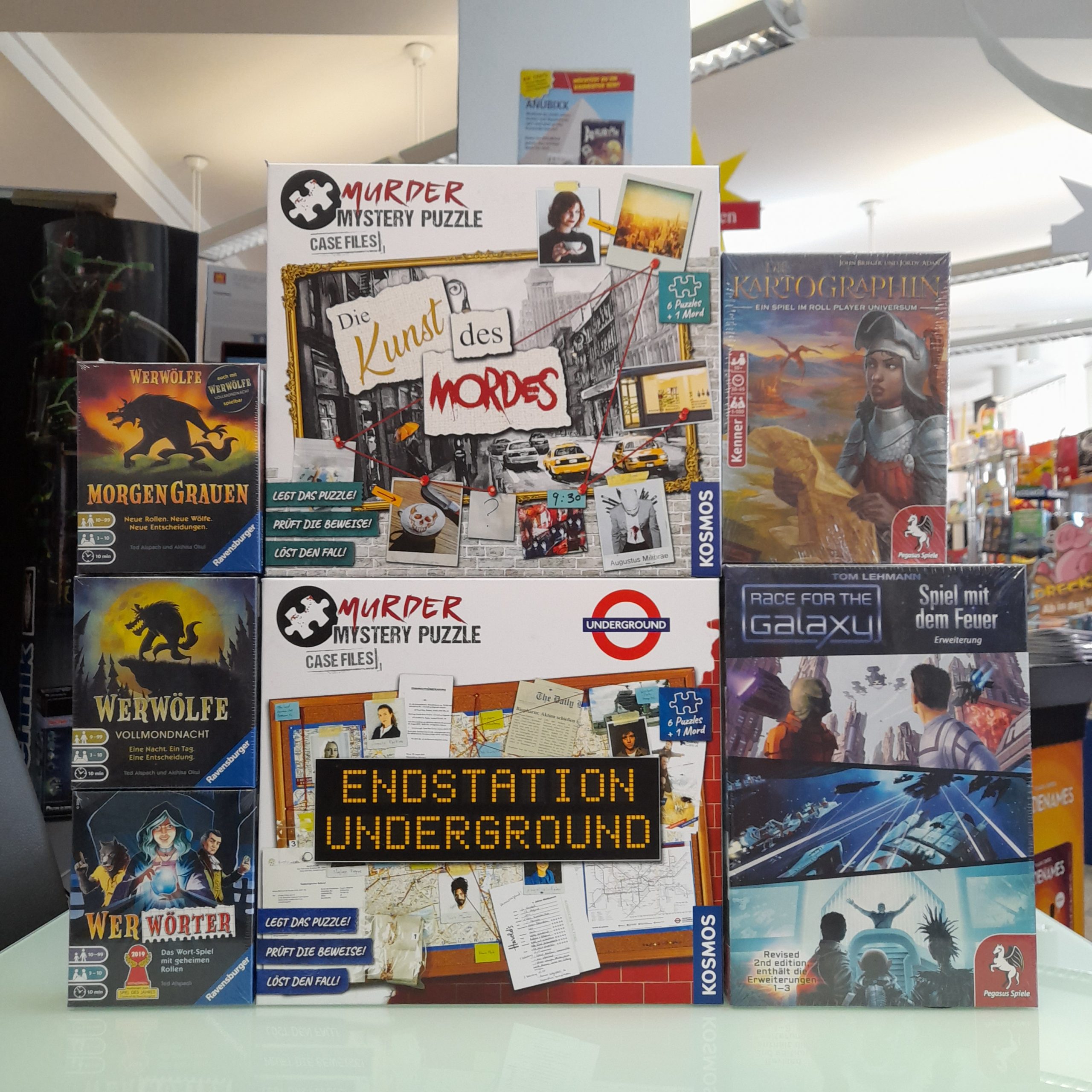 Die neue Linie von Kosmos hat uns erreicht – die Murder Mystery Puzzles. Auch das My City Roll & Write ist aufgetaucht. Jede Menge Werwolf Spiele haben wir nachgeordert. Aber auch die Ozeanien Erweiterung für Flügelschlag, die Kartographin oder die Race for the Galaxy Erweiterung sind wieder da. Drecksau könnt ihr jetzt auch in der To Go Version bei uns erwerben, und bei Pen & Paper hat sich was bei Pathfinder und bei DSA getan. Die Sternenträger Kampagne ist jetzt mit dem Abenteuer VI Die Worte der Orima vollständig geworden. Viel Spaß beim Bilder schauen, noch mehr Spaß bei einem Besuch bei uns.