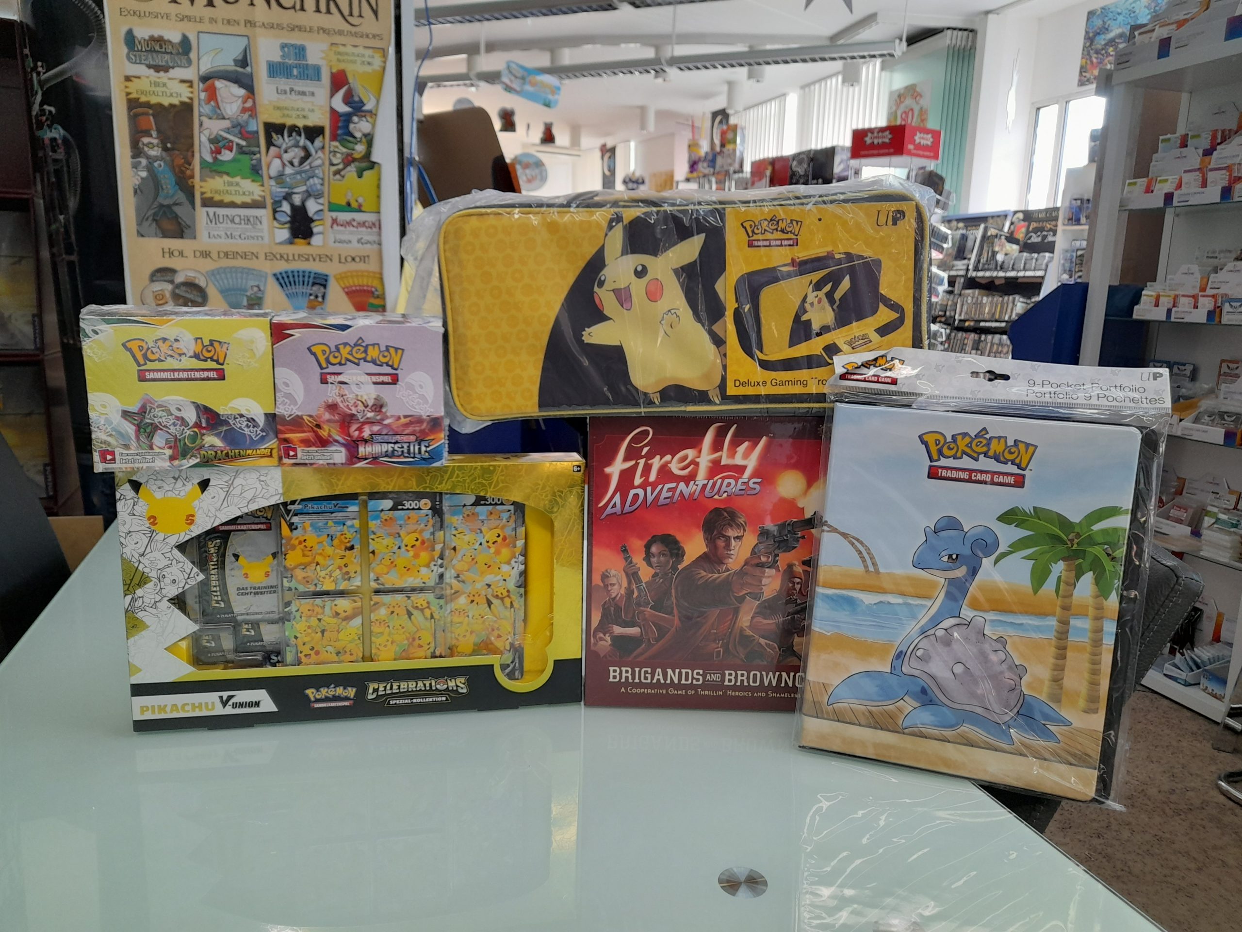 Wir haben die große Pokemon Sammeltasche da. Und auch noch Englische Pikachu Celebration Boxen haben wir noch einmal erhalten. Auch Drachenwandel und Kampfstile Booster sind noch einmal eingetroffen. Von Educa haben wir einige große Puzzles ins Haus bestellt. 6 Nimmt ist endlich wieder da. Und neu sind die Harry Potter Action Figuren. Und auch ein paar wenige Funko Pops haben wir wieder mal bekommen. Diesmal also sehr viel anderes als Spiele ins Haus gekommen.