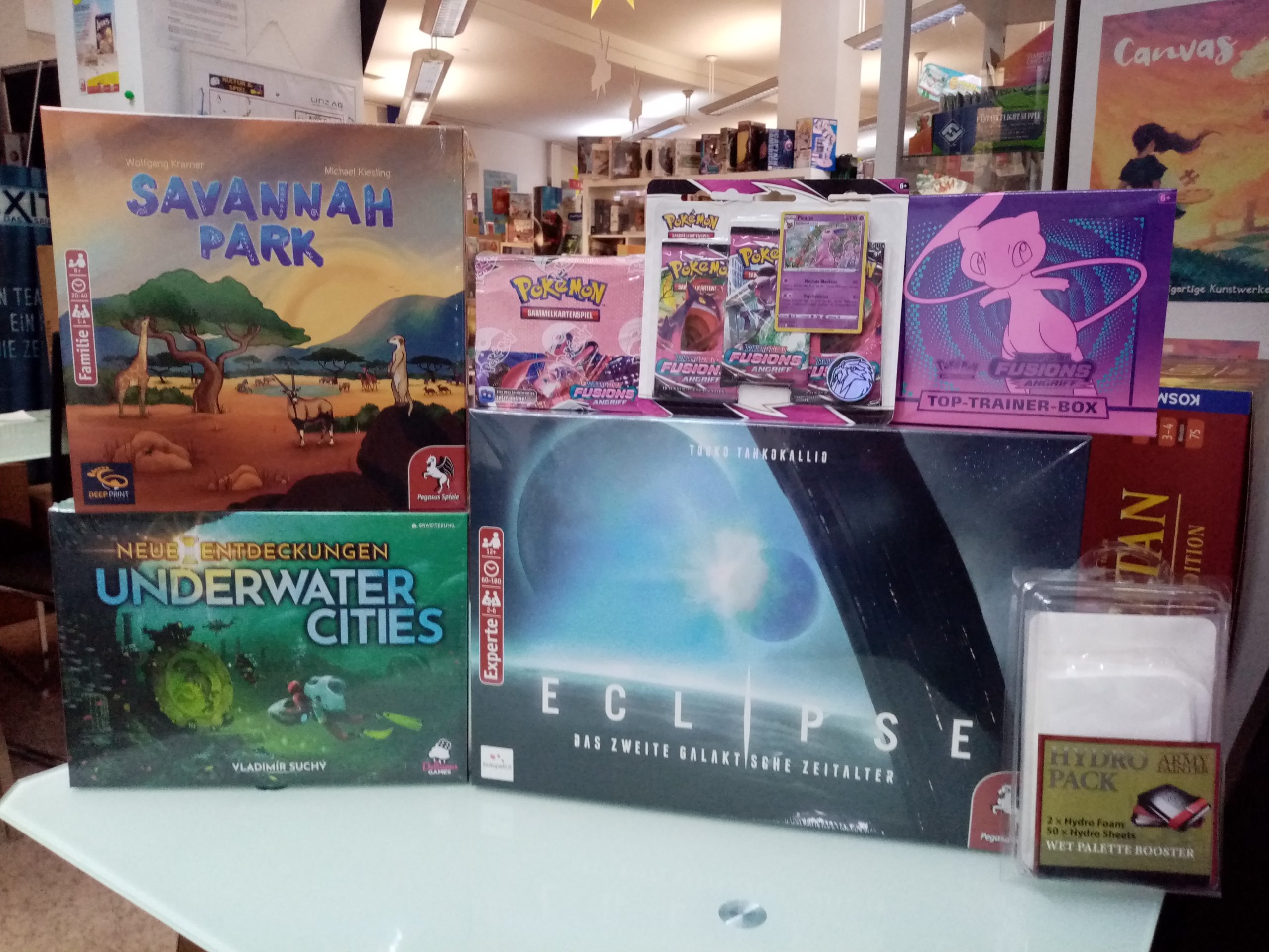 Wir haben rechtzeitig vor Weihnachten einige Pokemon Plüsch bekommen. Auch die neue Serie der Sammelkarten ist da – Fusionsangriff. Mit Family Inc und Alien on Board sind auch die Piatnik Neuheiten schon eingetroffen. Eclipse ist endlich wieder vorrätig. Auch ein paar neue Metal Earth Bausätze haben wir wieder ins Haus geholt und Savannah Park von Pegasus hat sich in kurzer Zeit zum Verkaufsschlager entwickelt – schnell und einfach, aber hoher Wiederspielwert. Dazu haben wir auch das deutsche Deck The Hood für Marvel Champions bekommen, englisch ist leider noch ausständig. Und auch bei Agricola gibt es einen neue Erweiterung für das C und D Deck. Wir freuen uns auf euren Besuch, auch während des Lockdowns müsst ihr nicht auf unsere Beratung verzichten.