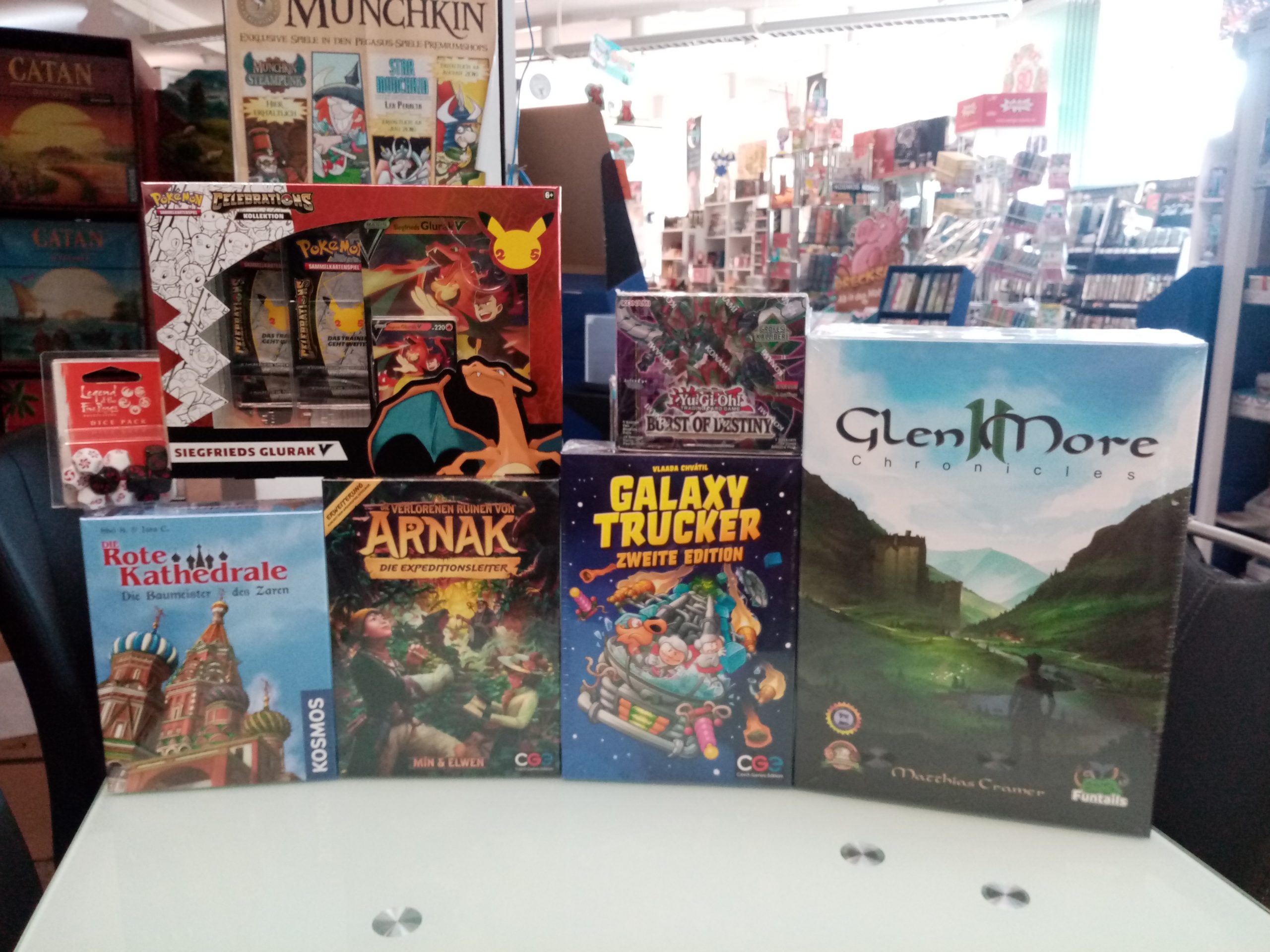 Die Rote Kathedrale ist im Haus. Auch unter den Neuheiten – Die Erweiterung für Ruinen von Arnak und Galaxy Trucker 2. Edition. Auch Neues von Pokemon ist dabei, derzeit am laufenden Band. Explorers, Glen More II und Unmatched Cobble & Fog sind unter den Rückkehrern. Auch die neue Yu-Gi-Oh Serie hat den Weg zu uns gefunden. Und ansonsten viel Spaß beim Bilder schauen und am besten einfach vorbei kommen.