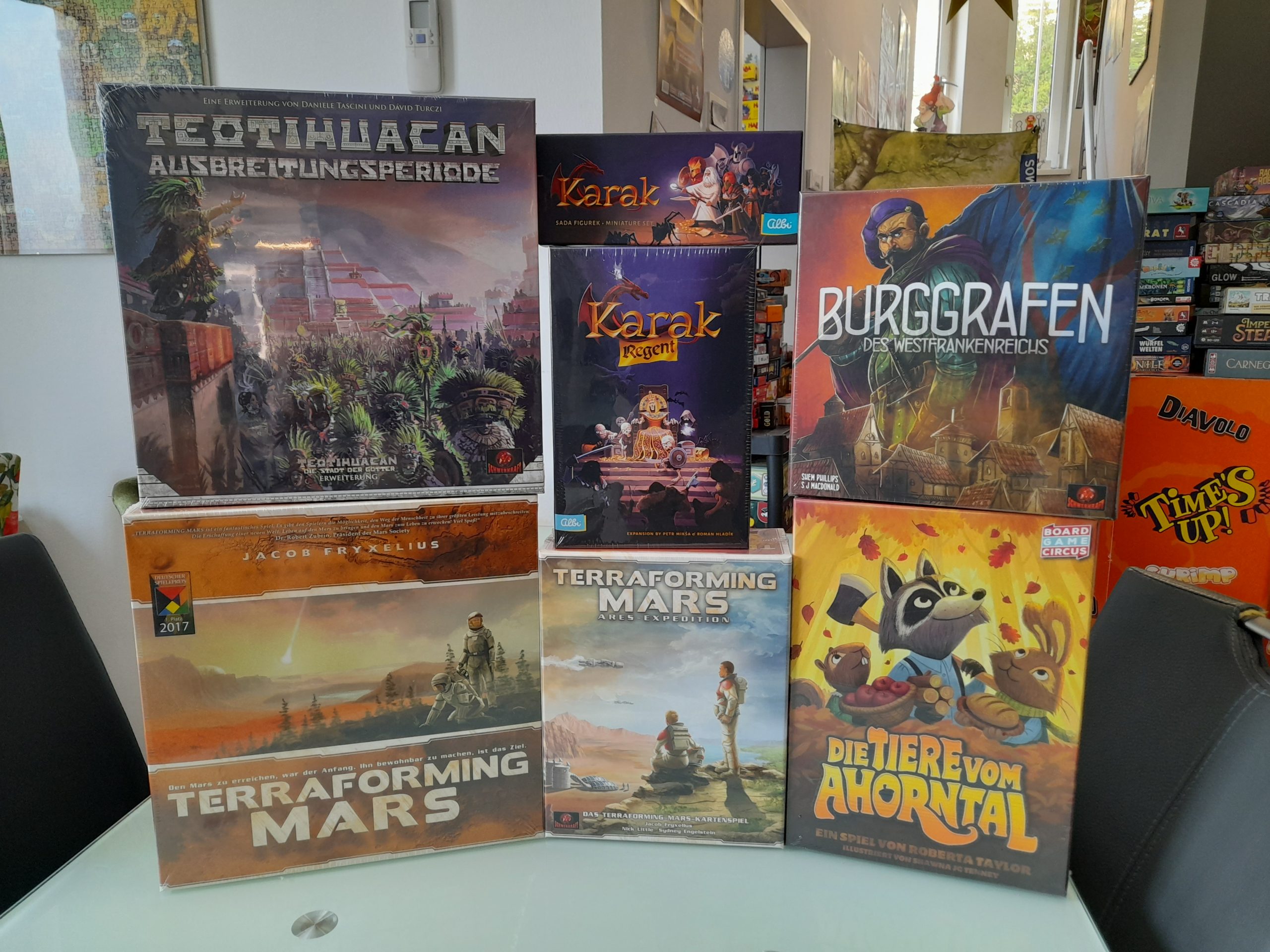 Terraforming Mars die Ares Expedition ist unsere meistgefragte Neuheit. Wir haben sogar schon Nachschub erhalten. Auch neu im Haus sind die Burggrafen des Westfrankenreichs. Und für die Familie sind Hungry Monkey und Sweet & Spicy die Neuerscheinungen. Cat Crimes, Patchwork und die Underwater Cities Erweiterung haben wieder den Weg zu uns gefunden. First Rat ist ein Dauerbrenner. Mit So Kleever haben wir auch einen weiteren Verkaufsschlager im Haus. Die Tiere vom Ahorntal liegen bereit um bei uns gespielt zu werden. Jabbas Palace ist ein Star Wars Spiel im Love Letter Universum. Ihr seht, es gibt viel zu berichten, einfach Fotos schauen, oder noch aktueller, einfach ins Geschäft rein kommen.