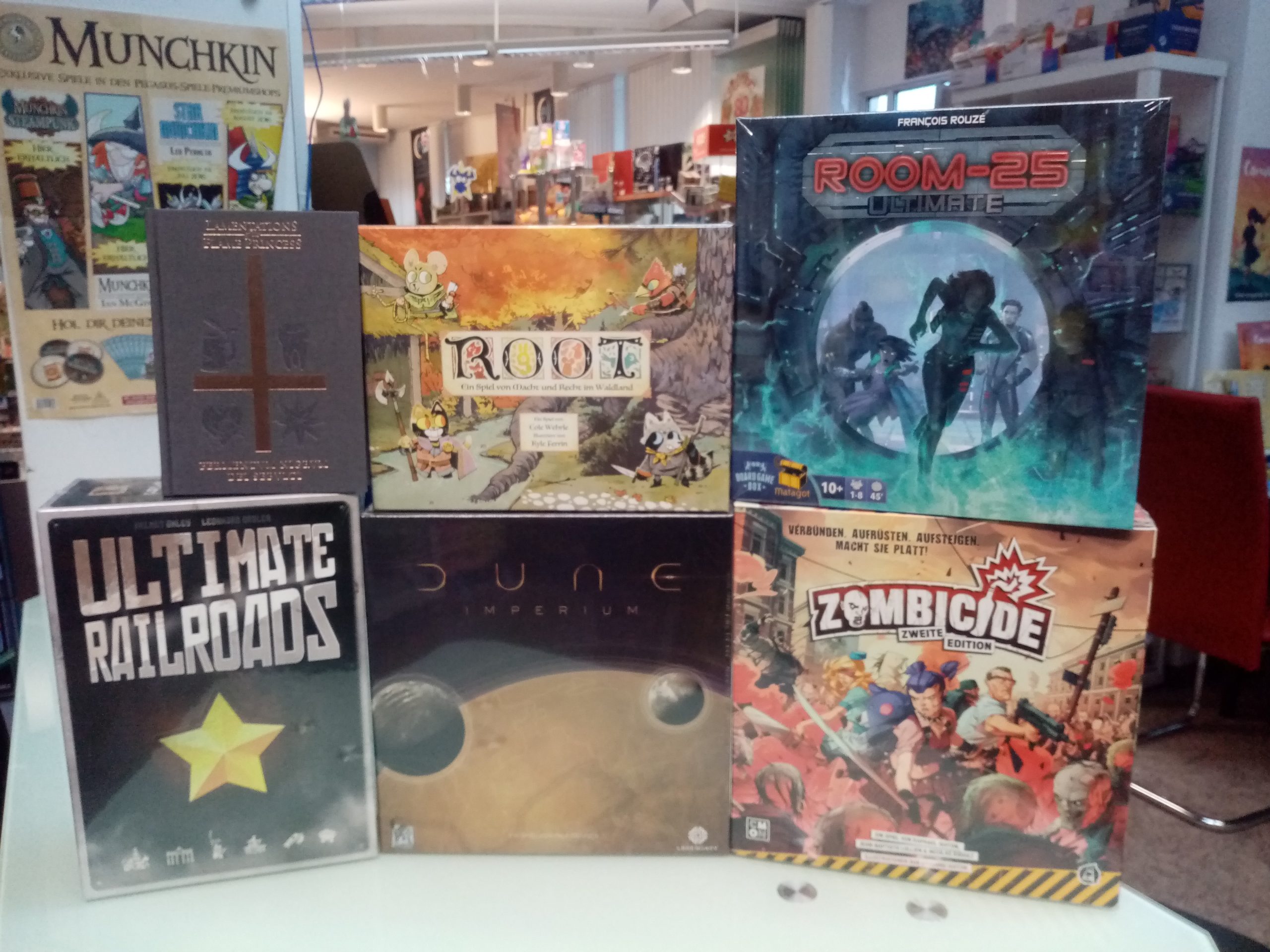 Neu erschienen ist die Big Box Ultimate Railroads. Bis 13.12. ist der Artikel nur im stationären Handel erhältlich, also Click & Collect ist möglich. Auch neu Nile, das neue Familienspiel von Board Game Box. Ebenfalls neu ist Family Business von Lookout Games. Und einiges der Beliebtesten Artikel bei uns im Haus ist wieder nachgeliefert worden wie Draftosaurus, Dune, Beyond the Sun oder auch Root. Aber auch Klassiker wie DKT oder Zombicide sind wieder eingetroffen. Und die Räuber von Skythien sind ebenfalls wieder lagernd. Also wie gewohnt jede Menge Auswahl.
