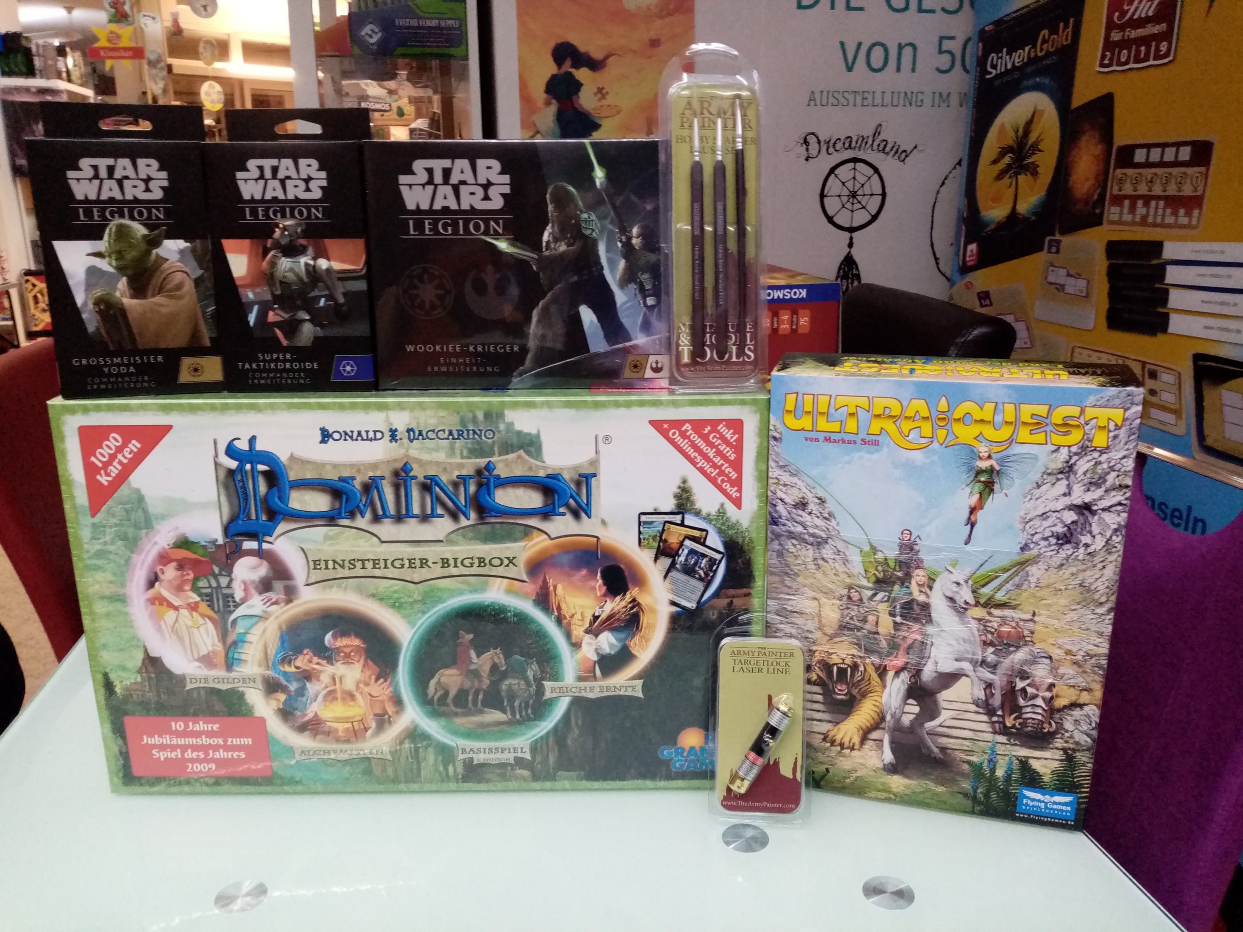 Nach langer Zeit haben wir endlich Ultraquest wieder im Haus. Die perfekte Umsetzung eines Rollenspiels auf Brettspiel. Auch die 2. und 3. Erweiterung zu Klinik haben wir endlich da. Star Wars Legion ist mit der neuen Wave präsent. Die Dominion Sammlerbox gibt es wieder, und auch die Big Box ist wieder lieferbar. Import Export haben wir auch im lagernden Sortiment. Und neu gibt es jede Menge Sleeves zu Marvel Champions. Gern sind wir für euch da mit Click & collect.
