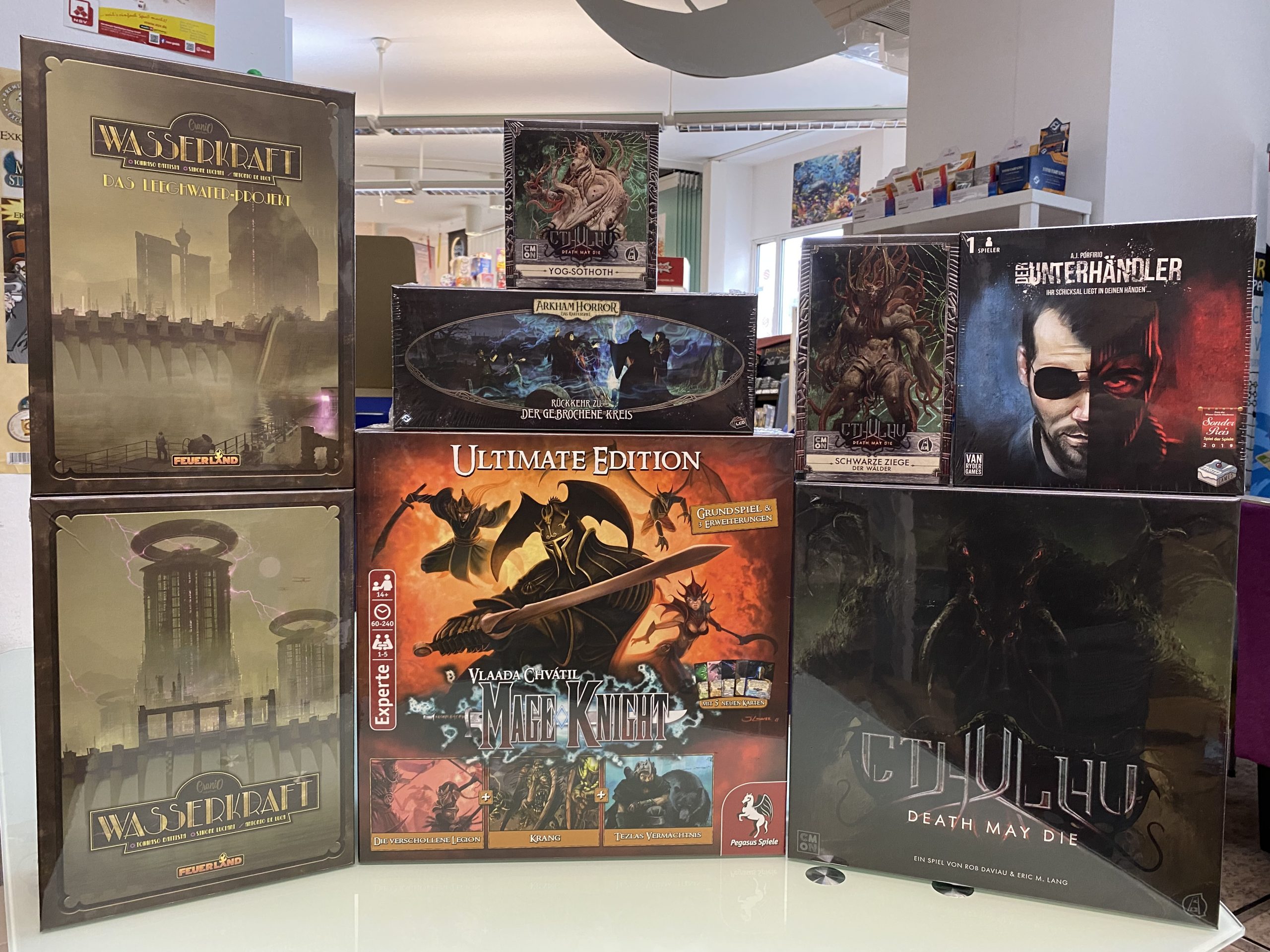 ENDLICH: Wie Wasserkraft Erweiterung ist da!! Das Das Leeghwater Projekt. Und die neue Rückkehr Box für das Arkham Horror LCG ist auch eingetroffen. Dazu haben wir wieder Mage Knight Ultimate Edition. Und auch Cthulhu Death May Die die Grundbox haben wir wieder da. Also ein Mega Nachschub. Auch bei Dungeons & Dragons ist einiges wieder ins Haus gekommen. Star Realms konnten wir Nachschub bekommen. Neue Pokemon Sammelalben sind da. Wir freuen uns, wenn ihr vorbei kommen wollt.